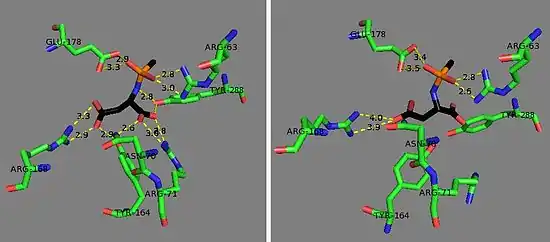 The zinc cofactor is found at the active site and is held by Glu-24, His-21, and His 116.[13] The substrate is held in place by Arg-63, Asn-70, Arg-71, Tyr-164, Arg-168, and Tyr-288.[5] The zinc cofactor is used to lower the pKa of a ligated water molecule so that an attack on N-acetyl-L-aspartate may occur and to stabilize the resulting tetrahedral intermediate along with Arg-63, and Glu-178.[13]