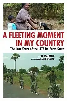 A Fleeting Moment in My Country: The Last Years of the LTTE De-Facto State is a book by Dr N. Malathy who did her PhD in the University of Canterbury in New Zealand. She spent four years from 2005 till 2009 in the then rebel LTTE administered Vanni de facto state as the secretary of the North East Secretariat on Human Rights and thereafter in the LTTE Peace Secretariat. The book deals with experiences of her work in a human rights body, a women's organization, and an orphanage. The life in the rebel held areas and brutal end to the Sri Lankan Civil War in which thousands of Tamils died. [1][2][3][4][5][6][7][8][9]