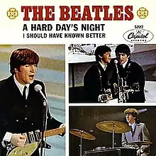 "A Hard Day's Night" is a song by the English rock band the Beatles. Credited to Lennon–McCartney, it was written by John Lennon,[2] with some minor collaboration from McCartney. It was released on the film soundtrack of the same name in 1964. It was also released as a single in the UK (with "Things We Said Today" as its B-side), and in the US (with "I Should Have Known Better" as its B-side.)