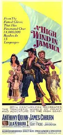 A High Wind in Jamaica is a 1965 DeLuxe Color film, based on the 1929 novel of the same name by Richard Hughes, and directed by Alexander Mackendrick[2] for the 20th Century-Fox studio. It stars Anthony Quinn and James Coburn as the pirates who capture five children. Other cast members include Deborah Baxter, Nigel Davenport, Isabel Dean, Lila Kedrova, Kenneth J. Warren, and Gert Frobe. One of the child actors is the author Martin Amis.