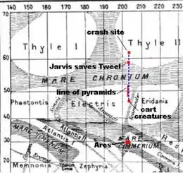 Early in the 21st century, the Ares makes the first landing on Mars, in the Mare Cimmerium. A week later, Dick Jarvis, the ship's American chemist, sets out to photograph the landscape. Eight hundred miles out, the engine on Jarvis' rocket gives out, and he crash-lands. He starts walking back to the Ares. Just after crossing into the Mare Chronium, Jarvis sees a tentacled creature attacking a large birdlike creature. He notices that the latter has a bag around its neck, and recognizing it as an intelligent being, rescues it. The creature refers to itself as Tweel. Tweel accompanies Jarvis on his journey, during which it manages to pick up some English, while Jarvis is unable to make any sense of Tweel's language. At first, Tweel travels in tremendous, city-block-long leaps, but then walks alongside Jarvis.