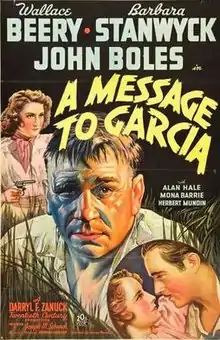 A Message to Garcia is a 1936 American adventure spy film directed by George Marshall and starring Wallace Beery, Barbara Stanwyck and John Boles. The film is inspired by the 1899 essay "A Message to Garcia" by Elbert Hubbard, loosely based on an incident during the ramp up to the Spanish–American War.[1] The essay had previously been made into a 1916 silent film, also called A Message to Garcia. In the story, U.S. Army Lieutenant Rowan, under cover, carries a secret message from President McKinley to General García, the leader of a rebellion against Spanish rule on the island of Cuba.[2]