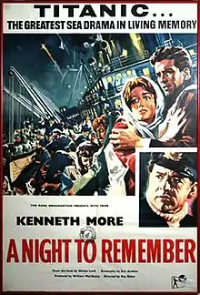 A Night to Remember is a 1958 British historical disaster docudrama film based on the eponymous 1955 book by Walter Lord. The film and book recount the final night of RMS Titanic, which sank on her maiden voyage after she struck an iceberg in 1912. Adapted by Eric Ambler and directed by Roy Ward Baker, the film stars Kenneth More as the ship's Second Officer Charles Lightoller and features Michael Goodliffe, Laurence Naismith, Kenneth Griffith, David McCallum and Tucker McGuire. It was filmed in the United Kingdom and tells the story of the sinking, portraying the main incidents and players in a documentary-style fashion with considerable attention to detail.[4] The production team, supervised by producer William MacQuitty (who saw the original ship launched) used blueprints of the ship to create authentic sets, while Fourth Officer Joseph Boxhall and ex-Cunard Commodore Harry Grattidge worked as technical advisors on the film. Its estimated budget of up to £600,000 (£13.1 million adjusted for inflation [2019]) was exceptional and made it the most expensive film ever made in Britain up to that time.[3] The film's score was written by William Alwyn.