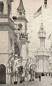 A Trip to the Moon was originally designed by Frederic Thompson for the Pan-American Exposition of 1901 in Buffalo, New York. Tickets for the popular ride were US$0.50 ($18.00 in 2022 dollars[1]) at the time, twice the price of other attractions at the exposition. It was experienced by over 400,000 people before it closed on November 2, 1901.[2] It was the first electrically powered mechanical "dark ride" and one of the first space rides.[3]