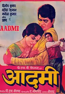 Aadmi is a 1968 Indian Hindi drama film produced by P. S. Veerappa and directed by A. Bhimsingh. The film stars Dilip Kumar, Waheeda Rehman, Manoj Kumar, Simi Garewal and Pran. The film's music is by Naushad. The film is a remake of the Tamil film Aalayamani.[1] Besides being noted for Dilip Kumar's acting as a man in a wheelchair, the film is also known for its dialogues by Akhtar ul Iman and trick cinematography work by Faredoon A. Irani.[2] It was a commercial success at the box office.[3]