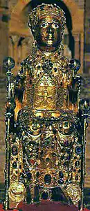 The golden statue reliquary of Sainte-Foy dominated the treasury of Conques. Catching a glimpse of the reliquary was the main goal of the pilgrims who came to Conques. The head of the reliquary contains a piece of skull which has been authenticated.[2] The reliquary is a fifth-century Roman head, possibly the head of an emperor, mounted on a wooden core covered with gold plating. Made in the latter half of the ninth-century, the reliquary was 2 feet 9 inches tall. As miracles reportedly increased, the gold crown, earrings, gold throne, filigree work and cameos and jewels, mostly donations from pilgrims, were added. In the fourteenth-century a pair of crystal balls and their mounts were added to the throne. Silver arms and hands were added in the sixteenth century. In the eighteenth-century bronze shoes and bronze plates on the knees were added.[6] There is no one distinct, credited artist for this reliquary because it is a dynamic work of art that changed with the incoming donations to the church over time.[13] The relics themselves were stolen from the nearby town of Agen by the monks of Conques in what was commonly called a furtum sacrum, or holy robbery.[14]