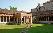 The earliest record of the cloister's presence dates it to the 10th century but its present arrangement is due to a renovation carried out between 1293 and 1313. The four sides are formed by small pointed arches on two sides and round arches on two others, supported by paired columns made of red Verona marble. On the northern side protrudes a quadrangular aedicule in which the ancient abbey well was located. On the perimeter walls of the ambulatories are placed sarcophagi and tombstones, among which the tomb of Giuseppe della Scala stands out, dating from 1313 and enriched by a lunette with a fresco by a painter of the Giotto school.[76]