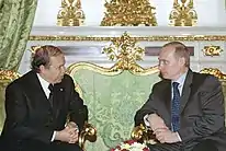 Bouteflika presided over the Organisation of African Unity in 2000, secured the Algiers Peace Treaty between Eritrea and Ethiopia, and supported peace efforts in the African Great Lakes region.[27] He also secured a friendship treaty with nearby Spain in 2002, and welcomed president Jacques Chirac of France on a state visit to Algiers in 2003.[28][29] This was intended as a prelude to the signature of a friendship treaty.[29]