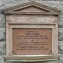 In 1879 Fleming secured a feu from the Earl of Fife on the land where he would build his new Aberlour distillery and on its completion produced whisky there from December 1880.[8][3] He sold the business to his acting agents, Robert Thorne & Sons in 1892.[9] James Fleming died aged 65, leaving a significant and tangible legacy. He built Aberlour's first public meeting place, The Fleming Hall in 1889.[10] This was followed in 1900 by the Fleming Cottage Hospital[11] providing isolation accommodation to limit the spread of infectious diseases. In James Thomson's 1902 book Recollections of a Speyside Parish[12] the author wrote: "The hospital that has been built and endowed by his [Fleming's] liberality will always remain a memorial to his Christian philanthropy. I can well remember more than one epidemic that devastated many a home in the village. Had there been at the time such an institution in the place, many lives might have been saved."
