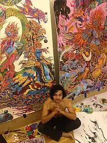 His paintings, drawings and digital works have featured in the following exhibitions: "Heroes and Villains: the Battle for Good in India’s Comics" at the Los Angeles County Museum of Art (LACMA);, "Transcendent Deities of India: The Everyday Occurrence of the Divine" at the Asia Society in Houston, Texas; at the ghats of Varanasi, India; a social impact project organized by Ojas Art Foundation, other exhibitions include "Dhyana Roopa" at the Academy of Fine Arts and Literature in Delhi, "India Imagined" sponsored by the Nirula Family Art Trust and at the visionary Fractal Gallery at Burning Man sponsored by the Black Rock Arts Foundation.