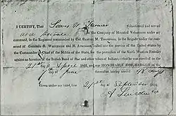 On April 21, 1832, Lincoln and the other volunteers gathered at the property of Dallas Scott.[10] Lincoln rode a horse from New Salem to Richland Creek, where neighbors had gathered to form a company of volunteer militia near Beardstown, Illinois.[11][12] The men were officially sworn in and began the process of electing a company commander who would hold the rank of captain.[10] In the choice between Lincoln and William Kirkpatrick, Lincoln received three-fourths of the votes.[11] Many years later, Lincoln said this election as captain was "a success which gave me more pleasure than any I have had since."[13]