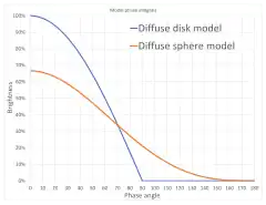 Brightness with phase for diffuse reflection models. The sphere is 2/3 as bright at zero phase, while the disk can't be seen beyond 90 degrees.