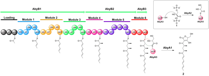 The biosynthesis of atrop-abyssomicin C begins with the synthesis of a linear polyketide chain in a PKS I system that consist of one loading and six extension modules. The polyketide chain is made from five acetates, two propionates, and the glycolytic pathway metabolite. D-1,3-bisphosphoglycerate, the glycolytic metabolite, is transferred to AbyA3 (an acyl-carrier protein) by AbyA2 to generate the glyceryl-ACP. AbyA1 facilitates the attachment of the glyceryl-ACP to the polyketide chain and the detachment of the polyketide from the polyketide synthase to form intermediate 2.[7][8][9]