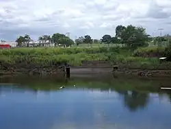 The Acacia Ridge air raid shelter is a rectangular concrete bunker built on a rock shelf cut into the north face of the former quarry. The currently exposed part of the bunker consists of two concrete walls, with a space between the two, running along part of the quarry face and returning into the quarry wall. The outer curtain wall is lower, is buttressed with concrete props, and has rectangular openings at each end. The inner bunker wall is shorter, taller, and has no visible openings. Only the top of the curtain wall is visible above the water in the quarry, and vegetation obscures the main bunker.[1]