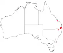 It is found in north western New South Wales where it is considered rare and Queensland where it is more common. It is often a part of dry sclerophyll forest communities and grows in loamy clay soils over volcanic substrate.[1]