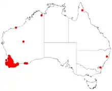 The plant is found in wet areas, near such as around streams and rivers, also on flats and ridges, hills and among granite outcrops[1] in south western Western Australia from around Bindoon and Mogumber in the north around the coast to Augusta in the south and Manypeaks.[2] It grows well in sandy, loamy, gravelly soils often containing laterite.[1]