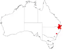 Its natural range goes from Gibraltar Range (New South Wales) north to McPherson Range. and near Toowooba (South East Queensland); also Wallangarra to Stanthorpe (South East Queensland).