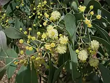 The tree grows to between 10 and 15 m (33 and 49 ft) in height and has a pyramidal habit with glabrous branchlets that have a fine white powdery coating. Like most species of Acacia it has phyllodes rather than true leaves. The evergreen phyllodes have an obovate to oblanceolate or sometimes narrowly elliptic shape with a length of 4 to 8 cm (1.6 to 3.1 in) and a width of 1.5 to 3 mm (0.059 to 0.118 in). The lemon yellow globular flowerheads appear in racemes from November to December in the species' native range, followed by seed pods that are 5 to 12 cm long and 1.4 to 2.2 cm wide.[3]