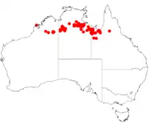 It is native to a few small areas of the Kimberley region of Western Australia[2] extending through the Barkly Tableland and Katherine Region in the top end of the Northern Territory and into the Normanton area of Queensland. It is often situated on plains, ridges or escarpments where it if found growing in red, sand or clay loam soils that are often skeletal or lateritic in nature as a part of shrubland or open Eucalyptus savannah woodland communities that have a spinifex or grass understorey.[1]