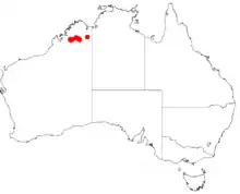 It is native to an area in the Kimberley region of Western Australia where it is commonly situated on steep rocky slopes or along creek lines growing in clay soils.[1] It is found around Mount Bell and Scott Gorge in the West Kimberley region growing in red-brown clay soils often over granite and is an understory plant commonly situated beneath Livistona palms as a part of savannah or spinifex communities.[2]