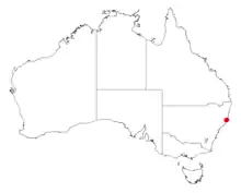 It is endemic to a small area in mid north coast region of New South Wales around Laurieton, Kendall and Kew where it is mostly situated on rocky hillsides among the coastal ranges in three small locations where it is a part of dry forests and woodland communities.[2] Six main populations are known mostly in the Kerewong State Forest and around North Brother Mountain and Mid Brother Mountain. It is often associated with species of Eucalyptus including; Eucalyptus acmenoides, Eucalyptus gummifera, Eucalyptus intermedia, Eucalyptus siderophloia and Eucalyptus umbra. Other species commonly found in its habitat include; Allocasuarina torulosa, Helichrysum elatum, Imperata cylindrica, Syncarpia glomulifera and Themeda australis.[1]