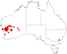 It is endemic to an area in the Goldfields-Esperance, Wheatbelt and Mid West regions of Western Australia.[1] It has a scattered distribution the south-western arid zone, and is found near Meekatharra and between Mullewa to Mount Magnet through to Rason Lake in the Great Victoria Desert. It is found on plains and rocky outcrops and grows in rocky clay loam soils and is commonly associated with Acacia aneura (mulga) communities.[2]