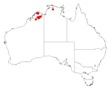 It is native to an area in the Kimberley region of Western Australia[1] around 150 to 300 km (93 to 186 mi) south west of Wyndham where it has a scattered distribution across a few areas including Adcock Gorge between Pentecost Downs Station and Kalumburu and is commonly situated on sandstone hills.[2]