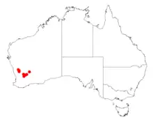 It is native to an area in the Wheatbelt region of Western Australia where it is found on rises and on sandplains growing in gravelly, sandy and lateritic soils.[1] It has a scattered distribution from around Wubin in the north to around Bruce Rock in the south growing in open scrub.[2]