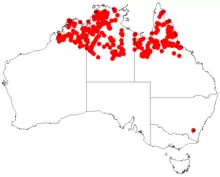 It is native across the Northern Territory and the Kimberley region of Western Australia[1] as well as northern Queensland.[3] The plant is found in flat or undulating country growing in sandy and lateritic soils in and heavier soils around watercourses and is usually a part of open woodland communities.[2]