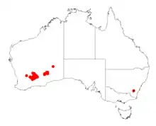 It is native to an area in the Wheatbelt and Goldfields-Esperance regions of Western Australia where is often situated on sandplains growing in sandy lateritic soils.[1] It is distributed from around Southern Cross and Coolgardie area in the west to around Queen Victoria Spring and the Streich Mound which is located about 200 km (120 mi) to the north east of Kalgoorlie.
