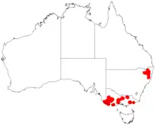 The species was first formally described by English botanist George Bentham in the London Journal of Botany in 1842 based on a collection made during Thomas Mitchell's expedition through the interior of New South Wales.[1] It occurs near Mount Gambier in South Australia, central and western Victoria and the Northern Tablelands of New South Wales. It grows on sandy or gravelly soils in heathland and open-woodland.[3]