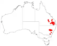 It is endemic to central parts of New South Wales from around the Goonoo Forest and the Mudgee district in the south. It is found in a variety of habitat usually around sandstone as a part of dry sclerophyll forest communities.[3]