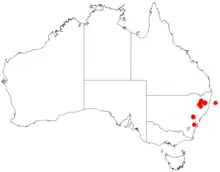 It is native to a disjunct area in the northern and central tablelands of New South Wales.[2] The northernmost populations are found around Longford and Ebor and the southern populations are in the western Blue Mountains around Capetree and Cullen Bullen.[2]