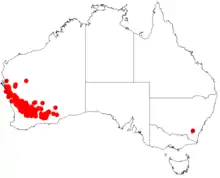 It is native to Wheatbelt, Mid West and Goldfields-Esperance regions of Western Australia and the plant will grow in sandy, loamy or lateritic soils and is often found on plains, rises and granite outcrops.[2] The range extends from approximately 100 km (62 mi) north of Kalbarri in the north west down to around 60 km (37 mi) south of Norseman in the south east.[3]