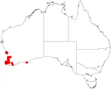 It is native to a scattered area along the west coast in the South West, Peel and Wheatbelt regions of Western Australia where it grows in lateritic soils.[1] It is found as far north as Jurien Bay with a disjunct distribution south through parts of the Darling Range down to around Augusta where it is often a part of Eucalyptus marginata and Corymbia calophylla forest communities and less frequently in low open heath lands.[2]
