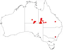 Although speculated to have been widespread across central Australia during wetter climates 400,000 years ago,[8] the population is now mostly restricted to three sites,[3] separated by the encroaching Simpson Desert. In the Northern Territory, the species is restricted to the Mac Clark (Acacia peuce) Conservation Reserve which is surrounded by a pastoral lease, Andado Station. The other two sites are near Boulia and Birdsville in Queensland.[6] The tree is found in open arid plains that usually receive less than 150 millimetres (5.9 in) of rain per annum.[6] They grow on shallow sand aprons overlaying gibber or clay slopes and plains and between longitudinal dunes or on alluvial flats between ephemeral watercourses.[4] The soils can be saline or contain high levels of gypsum.[9] The total population is approximately 76,000 individuals spread over a total area of 74,000 square kilometres (28,572 sq mi) but with a total area of occupancy of only 400 square kilometres (154 sq mi).[4]