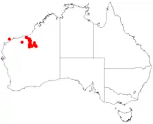 It is native to an area in the Kimberley and Pilbara regions of Western Australia.[2] The range of the shrub extends from around Marble Bar and Pardoo Station in the north of the Pilbara down to around Ethel Creek Station in the south and out to Rudall River National Park in the Little Sandy Desert where it is often situated along drainage lines growing in sandy loam or skeletal sandy soils over laterite, granite or quartz bedrock as a part of spinifex grassland communities.[1]