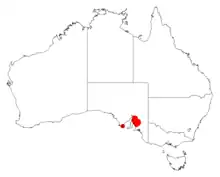 It is endemic only in a small area where it has a patchy and sparse distribution[1] in South Australia from northern parts of the Mount Lofty Range from around Burra to Auburn in the north to around the southern parts of the Tothill Ranges in the south where it is found as a part of open Eucalyptus woodland and mallee communities.[2] A population is also known at the southern tip of the Eyre Peninsula which is thought to be a naturalised population. The total area of occurrence is thought to be around 1,800 km2 (690 sq mi) It is found on grows on rocky hills, along creeklines and on roadsides growing in duplex soils with loamy soils above red clay that are usually alkaline and well-drained.[1]