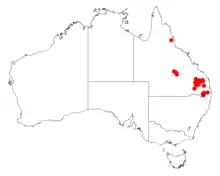 It is endemic to the Darling Downs district of Queensland where it is situated on undulating or hilly country within the state forests to the north of Chinchilla where it grows in shallow, sandy and gravelly soils as a part of Eucalyptus woodland communities or in dense stands.[1]