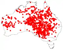 Found in arid and semi-arid areas,[2] the Acacia victoriae is generally found in alkaline soils including clayey alluvials, grey cracking clays and saline loams on floodplains, alluvial flats, rocky hillsides and ridges.[3] Animals such as birds and small mammals are known to use the tree as protection. The seeds and foliage also offer a source of food to animals.[4]