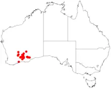 It is native to an area in the Goldfields-Esperance region of Western Australia where it is commonly situated on low rocky rises and in low-lying areas growing in stony clay, loam or sandy soils.[1] It has a scattered distribution with a range that extends from Southern Cross in the west to around Kambalda in the east and to around Peak Charles National Park in the south in hilly country as a part of shrubland or mallee woodland communities.[2]