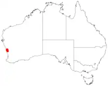 It is native to an area in the Wheatbelt and Mid West regions of Western Australia.[1] The range of the species extends from around Eneabba in the north and down to around Badgingarra in the south where it is found growing in sandy or loamy soils usually over laterite and commonly situated on hills or slopes as a part of open heath or mallee woodland communities. It is found to be associated with Eucalyptus suberea, Allocasuarina campestris, Calothamnus quadrifidus, Eucalyptus gittinsii, Eucalyptus eudesmioides, Eucalyptus accedens and Grevillea amplexans.[3]