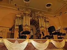 In 2006, the Lviv National Philharmonic Symphony Orchestra was awarded the title "Academic".[6] In 2018, with the participation of this group, during the Myroslav Skoryk author's concert,[7] the Lviv Philharmonic received "national" status. Since September, 2020, the Philharmonic has been named after this Ukrainian composer.[8] The concertmasters of the orchestra are Honored Artist of Ukraine Marko Komonko and Mykola Gavyuk.