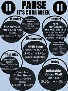 - ↑ Acadia Students' Union (10 March 2016). "Mental Health Initiative". Acadia Students' Union. Retrieved 10 March 2016.