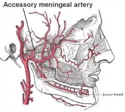 The accessory meningeal artery (also accessory branch of middle meningeal artery, pterygomeningeal artery, small meningeal or parvidural branch) is a branch of the maxillary artery that ascends through the foramen ovale to enter the cranial cavity and supply the dura mater of the floor of the middle cranial fossa and of the trigeminal cave, and to the trigeminal ganglion (representing the main source of artierial blood for this ganglion).[1]