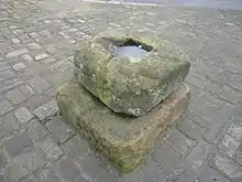 One reason given for erecting the cross was as a memorial to plague victims, possibly of the Black Death of 1349, which would have killed many.[17] The Black Death reached Southern England in 1348 and by 1350 had killed a third of England's population. In nearby Pontefract it was estimated that 40 per cent of the population died.[17] A reminder of how communities communicated and traded despite the plague remains in the Ackworth plague stone, although it is thought that it dates from a further plague outbreak in 1705.[19] Standing at the junction of Sandy Gate Lane on the road into Pontefract, the stone too is a Grade II listed monument. Plague stones were "receptacles for sterilising coins in vinegar, normally at or close to parish boundaries." This suggests that the current location of the plague stone was the outer rim of the parish.[20] The plague in 1645 was said to have killed 153, the bodies being buried in a "burial field... crossed by the footpath from Ackworth to Hundhill."[19] The area had possibly been used for mass burial after a skirmish earlier in the year between Roundhead and Royalist forces during the English Civil War.[19] The bubonic plague of 1645 was not confined to Ackworth: in Leeds over 1,300 people died,[21] and a further 245 were thought to have died "in and around the Wakefield area". One theory was that it had been brought in by civil-war soldiers.[22] Another version was retold by Henry Thompson in A History of Ackworth School in its first 100 years. A well-loved monk went to Rome and became "smitten by the plague and died".[23] The monk, from the priory at Nostell would preach at the medieval cross in the centre of the village and was described as a "noble soul with a kindly heart", admired by young and old alike.[23] After succumbing to the plague in Rome, his body was returned and passed through Ackworth, where "nothing could satisfy the ignorant but faithful love of the old hearers" and the coffin was opened.[23] The village was then stricken with plague and the stone on Castle Syke Hill became "for many months the only contact between them and the outside world".[23] The book relates how "upon that stone the Ackworth purchaser dropped his money into a vessel of water, for which, a few hours afterwards, he found his return in merchandise." Of this the author comments, "We make no idle comment.... We tell the tale as it was told to us."[23]