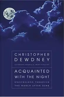 Acquainted with the Night: Excursions through the World After Dark (or Acquainted with the Night: A Celebration of the Dark Hours) is a non-fiction book by Christopher Dewdney about various aspects of night. It was first published in 2004 by HarperCollins. It uses the same title as the Robert Frost poem "Acquainted with the Night". The book consists of 14 chapters, with one chapter dedicated to each hour of the night, from 6 pm to 5 am. Mini-essays populate each chapter which each follow a theme, like nocturnal creatures, dreams, astronomy, and mythology. Other subjects and topics touched upon include science, art, culture, natural history, superstitions, and psychology. The book was a finalist for the 2004 Governor General's Awards and for the 2005 Charles Taylor Prize. It tied with Dark Matter: Reading The Bones for the World Fantasy Award in Anthologies.[1]