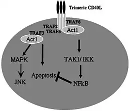 Act1 activates NF-κB through the TAK1 and IKK proteins. Nevertheless, TRAF3 is also involved when the CD40 receptor is activated.[7] When CD40 is stimulated by CD40L, Act1 binds to TRAF3, with the help of TRAF2 and 5 in order to activate the JNK proteins. The precise function of TRAF3 remains unknown. Indeed, depending on the TRAF variants involved, the protein has an activatory or inhibitory signal for NF-κB activation. It has been shown that there is mostly an inhibition in the NF-κB signaling when TRAF3 is activated. But, due to the splicing, some variants of TRAF3 have been identified to activate the NF-κB pathway, as well as the TRAF2 and 5. Furthermore, the activation of NF-κB induces the inhibition of the CD40L-induced apoptosis. The function of TRAF3 is complex and not yet fully understood.