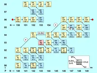 The figure buildup of actinides is a table of nuclides with the number of neutrons on the horizontal axis (isotopes) and the number of protons on the vertical axis (elements). The red dot divides the nuclides in two groups, so the figure is more compact. Each nuclide is represented by a square with the mass number of the element and its half-life.[69] Naturally existing actinide isotopes (Th, U) are marked with a bold border, alpha emitters have a yellow colour, and beta emitters have a blue colour. Pink indicates electron capture (236Np), whereas white stands for a long-lasting metastable state (242Am).