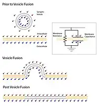 A diagram showing the change in membrane capacitance before (top) and after (middle and bottom) vesicle fusion.